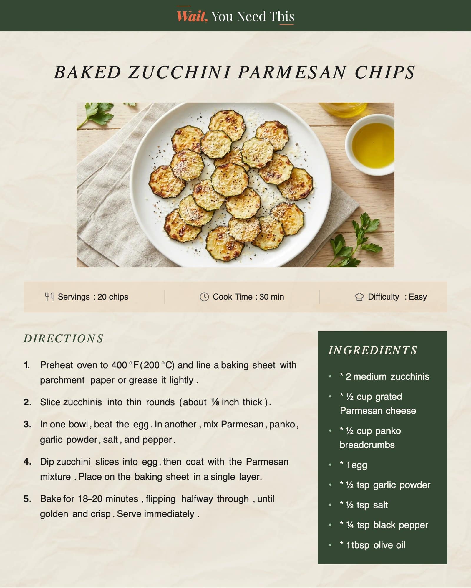 I make these most often when I want something crunchy but lighter than regular chips; these baked zucchini parmesan chips are quick enough for a weeknight and easy enough to repeat whenever zucchini is sitting in your fridge.