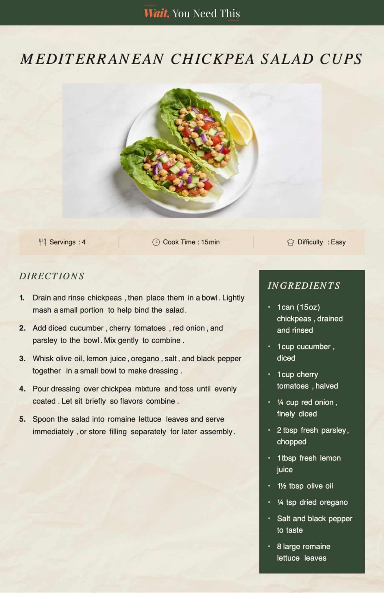 Mediterranean chickpea salad cups combine chickpeas, fresh vegetables, herbs, and lemon dressing served inside crisp lettuce leaves.