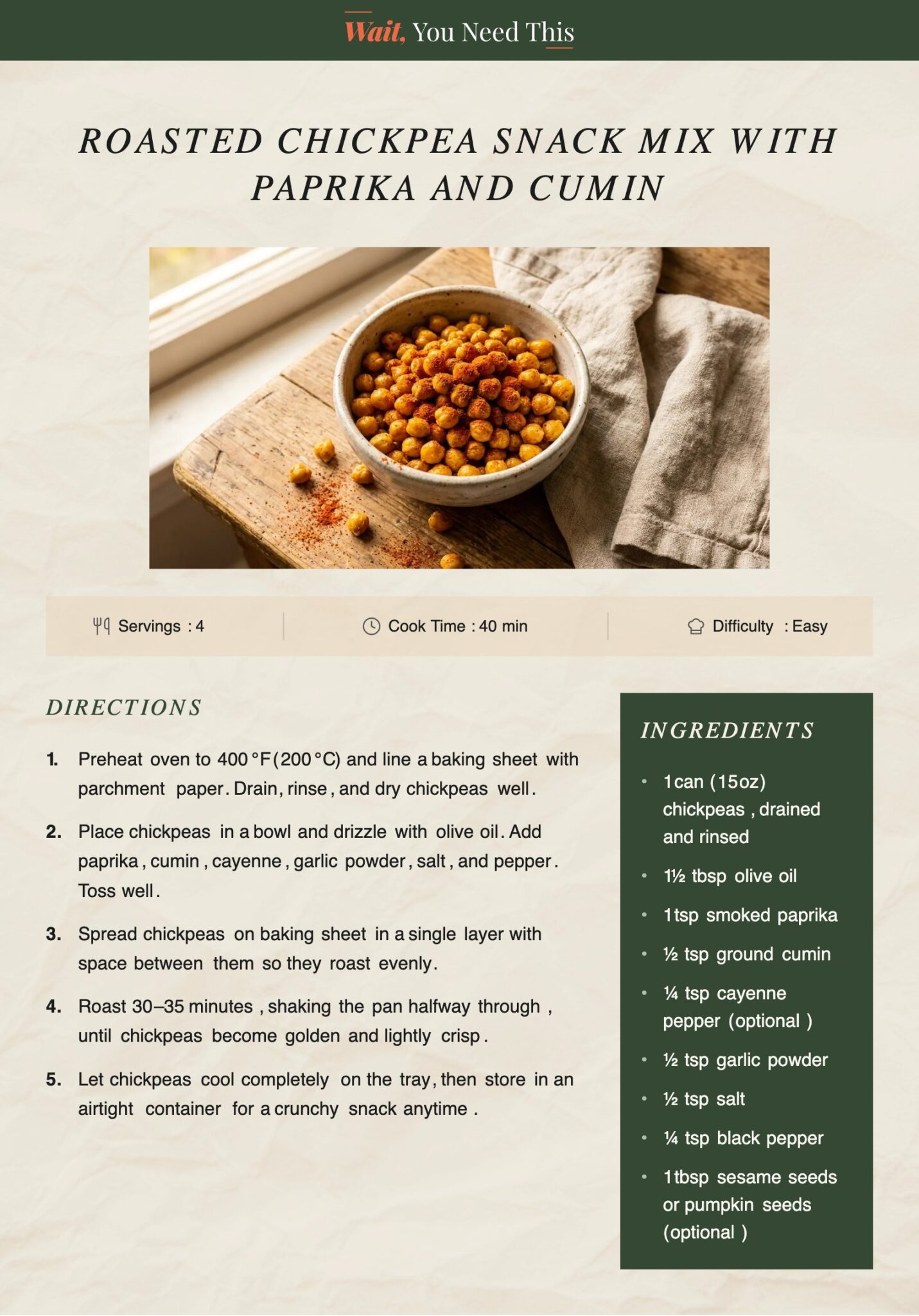 When chickpeas roast in the oven, they turn lightly crisp on the outside while staying soft inside. Adding smoked paprika and cumin brings warmth and depth, making them far more interesting than plain roasted beans.