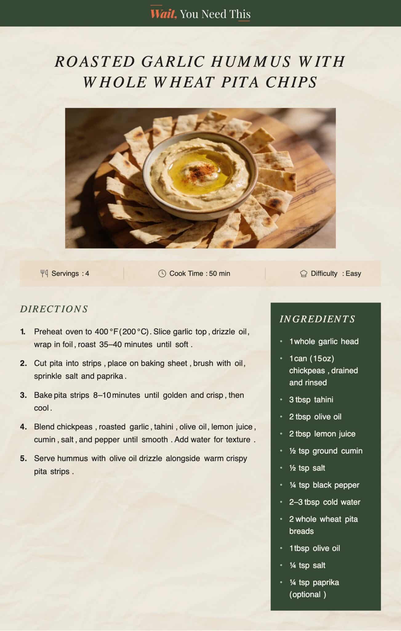 Serving size: 4 tbsp hummus with 5 pita strips | Nutritional values: ~230 kcal | Protein: 8g | Carbohydrates: 29g | Fat: 9g | Vitamins: B6, C Servings: 4 | Total Time: 50 minutes