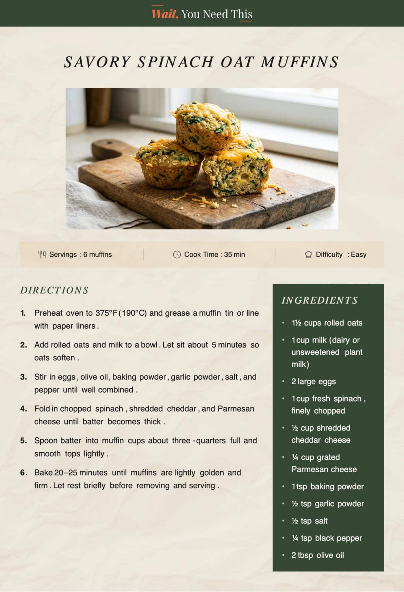 Rolled oats replace traditional flour, giving the muffins a sturdy texture that keeps you satisfied for longer. Fresh spinach and cheddar bring flavor and balance, making each one feel closer to a small meal than a snack.
