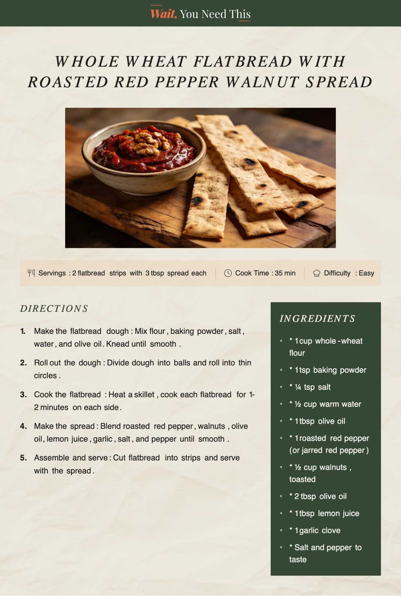 This combination of whole-wheat flatbread with roasted red pepper walnut spread is both simple and filling. It’s a snack that can easily be made in 35 minutes, with minimal prep and effort.